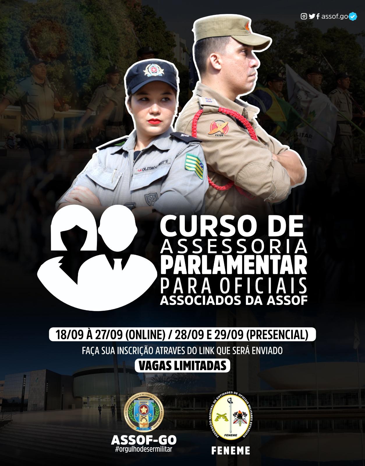 A Associação dos Oficiais da Polícia e Corpo de Bombeiros Militar do Estado de Goiás (ASSOF-GO) realiza, entre os dias 18 e 29 de setembro, o curso “Assessoria Parlamentar” , direcionado aos oficiais filiados. As aulas serão ministradas de forma híbrida com encontros on-line, entre os dias 18 a 27, e presenciais nos dias 28 e 29 deste mês.