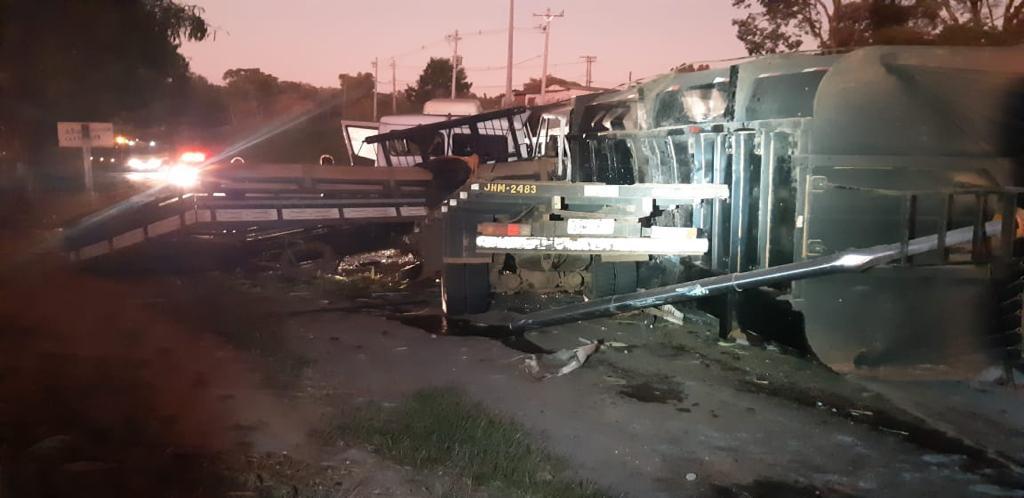Na manobra evasiva, o último semirreboque da combinação teria colidido contra a traseira do carro. Ato contínuo, um caminhão que trafegava em sentido oposto colidiu contra o semirreboque. Houve derramamento da carga de calcário do rodotrem sobre a rodovia, que está com apenas uma das faixas liberadas. O trânsito é controlado no local e segue em sistema de siga e pare.