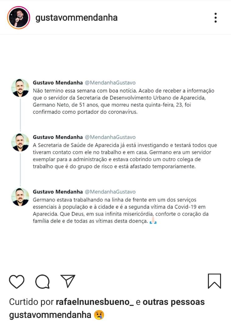 O Prefeito Gustavo Mendanha anunciou através das suas redes sociais no final do expediente desta sexta-feira (24), o falecimento de mais um paciente contaminado pelo novo vírus COVID-19. Essa segunda vítima fatal é um funcionário público lotado na secretaria de desenvolvimento urbano do município SDU. Germano Neto de 51 anos de idade estava cobrindo um colega que foi afastado das atividades devido pertencer ao grupo de risco de contaminação. Na publicação, o chefe do executivo lamentou a morte do funcionário, considerado exemplar no desenvolvimento de suas atribuições.